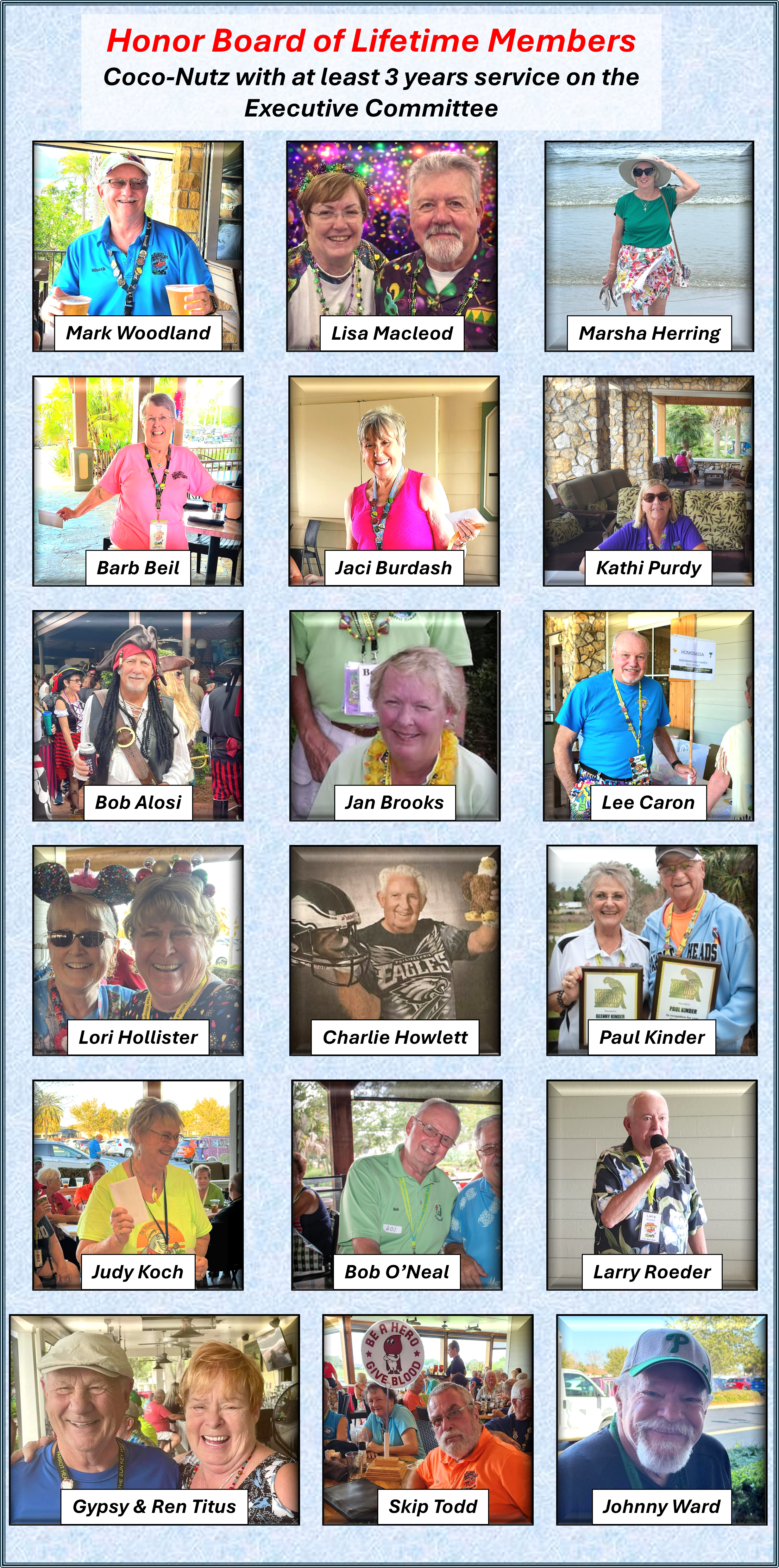 The COCO-NUTZ is the name Fondly given to your Board of Directors. Please read about them and their functions so you know who to contact for ANY question.